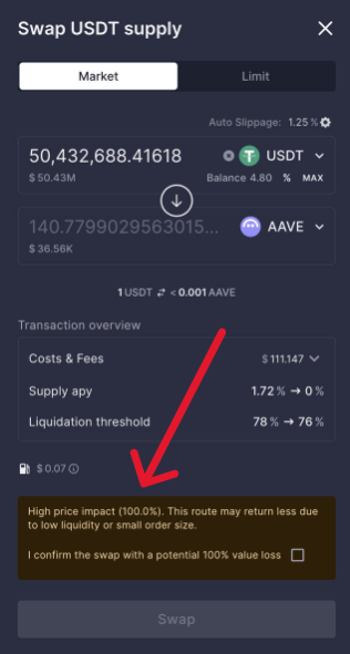 Para continuar, el usuario, explican desde Aave, debió marcar un checkbox que decía explícitamente «Confirmo el swap con una potencial pérdida del 100% de valor». El usuario lo habría confirmado.