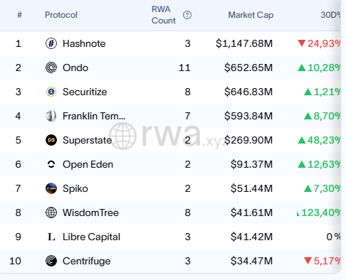 Actualmente, el protocolo Ondo Finance cuenta con una capitalizaciรณn de mercado de 652 millones de dรณlares, consolidรกndose como el segundo mayor emisor de bonos del Tesoro de EE.UU. tokenizados a nivel mundial, conforme a datos del sitio rwa.xyz.