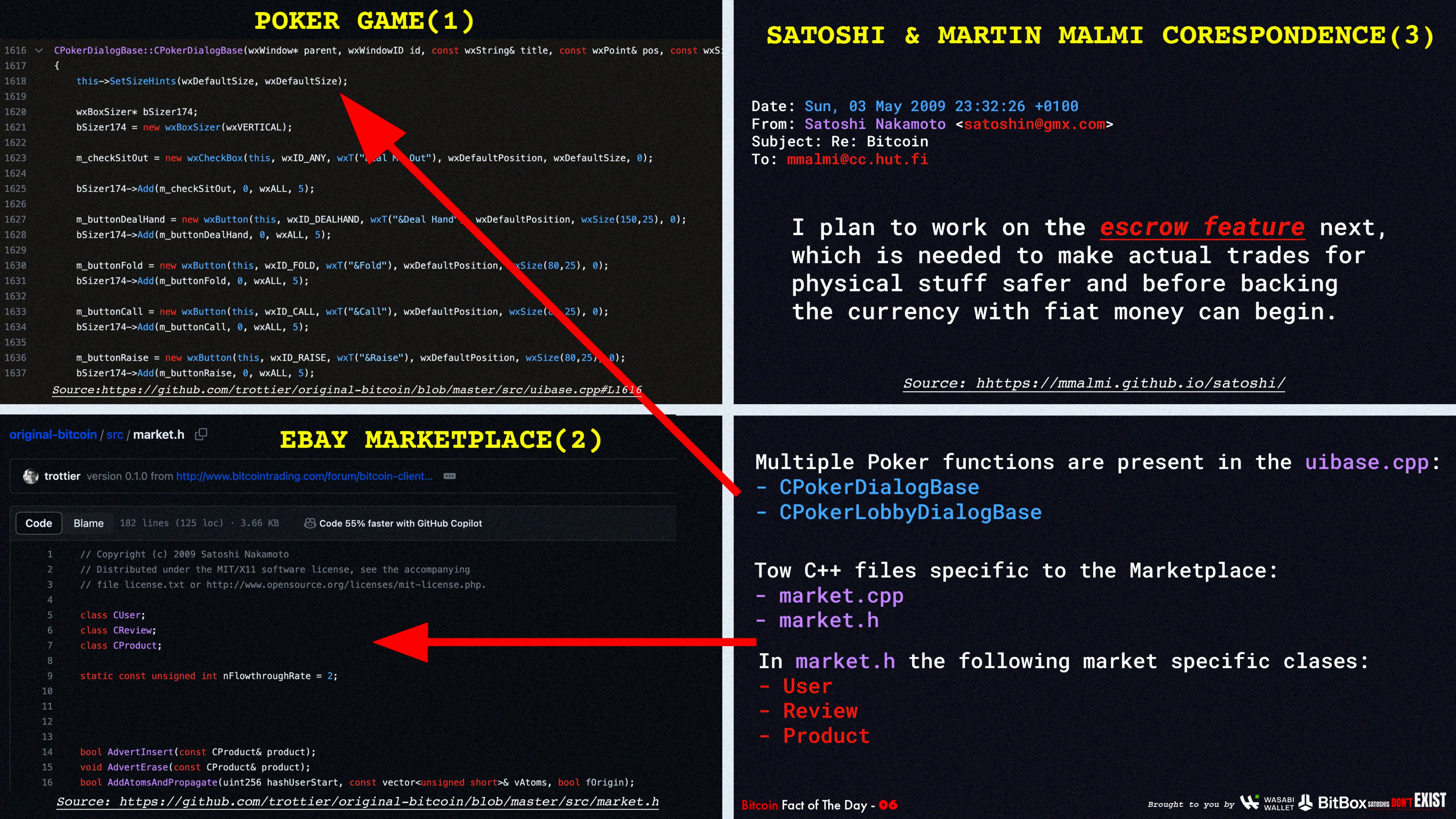 Waltz respondió que, aunque esto es posible, el único código que se sabe con certeza que fue copiado en Bitcoin es el relacionado con las funciones criptográficas, tomadas de la librería Crypto++. Esto sugiere que, al menos en parte, las ideas del juego de póker y el mercado podrían haber sido un intento genuino de Nakamoto por explorar aplicaciones prácticas para Bitcoin, adelantándose a funcionalidades que los desarrolladores posteriores integraron no solo en Bitcoin, sino en todas las redes de criptomonedas con máquinas virtuales.
