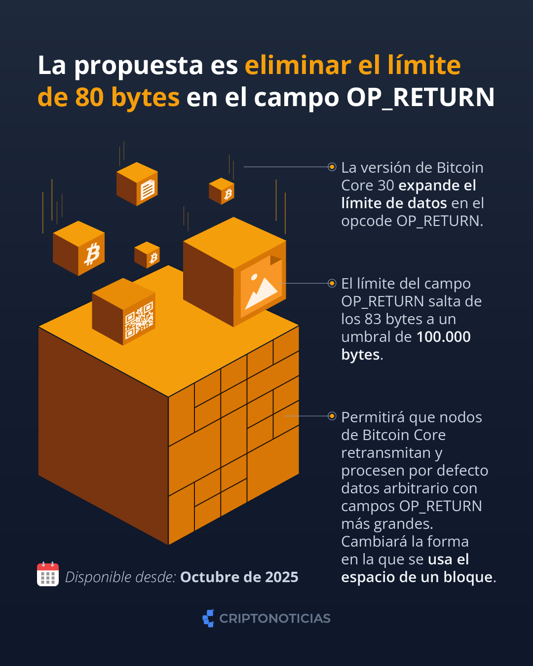 Como reportó CriptoNoticias, Bitcoin Core v30 elevará ese límite a 100.000 bytes, lo que permitirá la inscripción de un mayor volumen de datos arbitrarios (imágenes, audio, texto) en los bloques de la red.