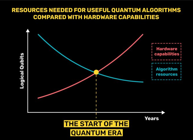 Además, dos curvas ilustran tendencias opuestas en la imagen: la curva roja ascendente muestra el crecimiento de las capacidades del hardware cuántico, que aumenta con el tiempo gracias a mejoras en la construcción de cúbits y corrección de errores, mientras que la curva azul descendente indica la disminución de los recursos necesarios para algoritmos cuánticos a medida que estos se optimizan.