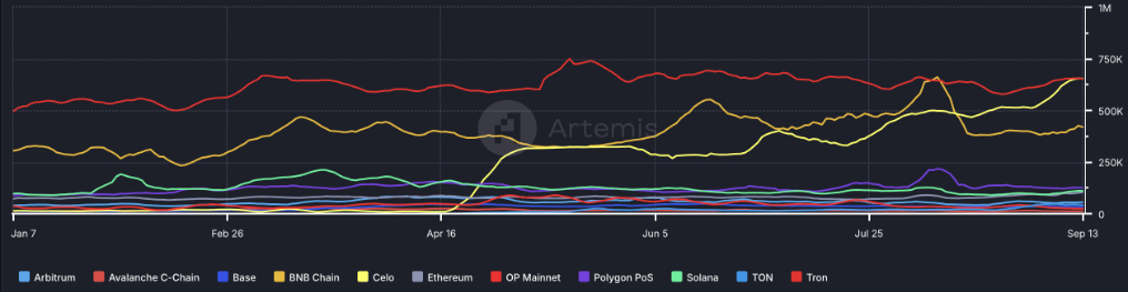Con respecto al informe proporcionado por Artemis sobre la L1 de Celo, se destacó que esta red superó a Tron (TRX) en cuanto a la cantidad de direcciones activas diarias vinculadas al uso de stablecoins. Esta información se puede apreciar en el siguiente gráfico.