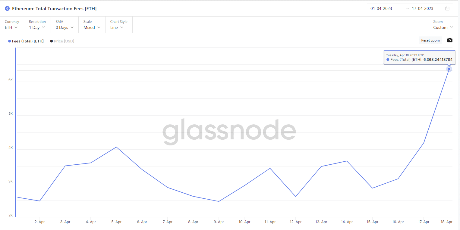 Segรบn datos de la firma de analรญticas on-chain Glassnode, el sรกbado 15 de abril se gastaron 2.853 ETH en tarifas de gas en la red Ethereum. Tres dรญas mรกs tarde, el 18 de abril, la jornada cerrรณ con un gasto de 6.368 ETH (aproximadamente USD 12,7 millones) en comisiones.