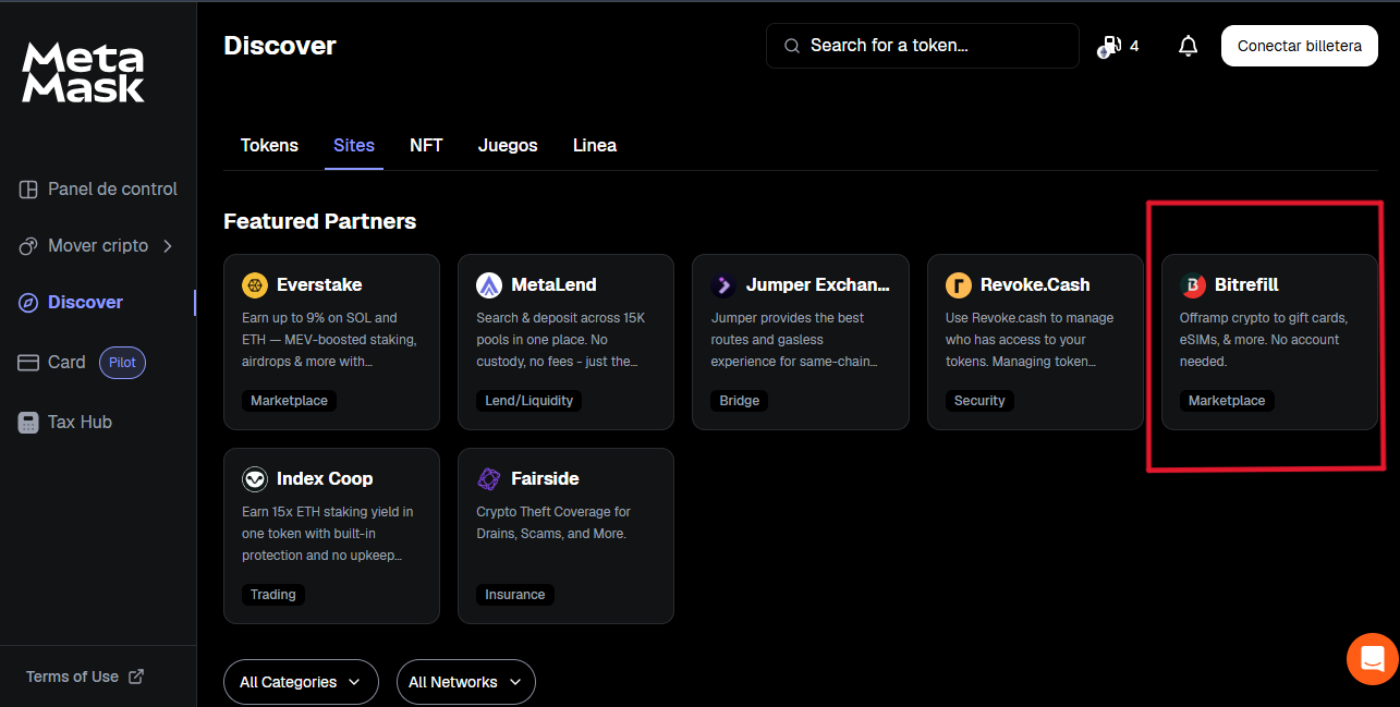 Una vez conectado, el usuario puede navegar por el catálogo de Bitrefill, seleccionar una tarjeta de regalo, elegir la criptomoneda de pago y completar la transacción directamente desde su monedero.