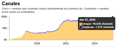Además, en el siguiente gráfico provisto por Bitcoin Visuals se observa que los canales entre nodos ya conectados (línea azul) han caído desde marzo de 2022 al momento de esta redacción desde los 4.100 a 2.900. Este dato refuerza la idea de que los usuarios están optando por servicios que gestionan canales de pago por ellos, como los ofrecidos por exchanges como Coinbase.