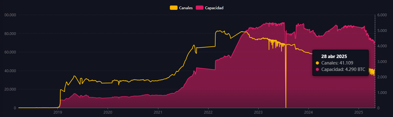 Si bien al tiempo de este artículo la capacidad total de los canales de la Lightning Network se sitúa en alrededor de 4.300 BTC, esta estadística registró hasta febrero pasado una estabilidad en torno a los 5.000 BTC desde 2022, según datos del explorador Mempool.space.