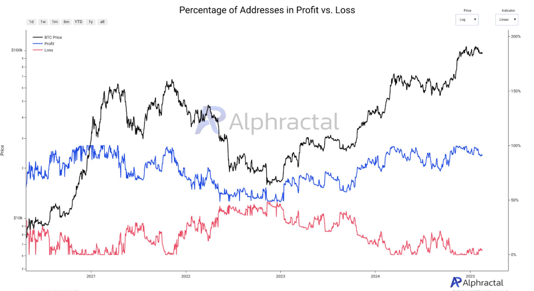 El gráfico anterior destaca que, a pesar de los retrocesos en la cotización de Bitcoin, históricamente la proporción de direcciones en ganancias se ha mantenido alta. Por ejemplo, en ciclos alcistas anteriores como los de 2017 y 2021, hubo momentos donde la proporción de wallets en pérdida superó el 20%, según Alphractal.