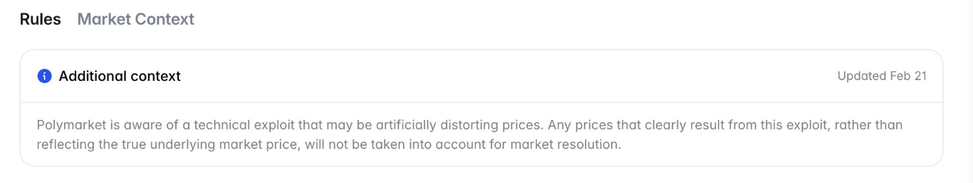 «Polymarket tiene conocimiento de un exploit técnico que podría estar distorsionando los precios de manera artificial. Cualquier precio que resulte claramente de este exploit, en lugar de reflejar el verdadero precio de mercado subyacente, no será tomado en cuenta para la resolución del mercado».