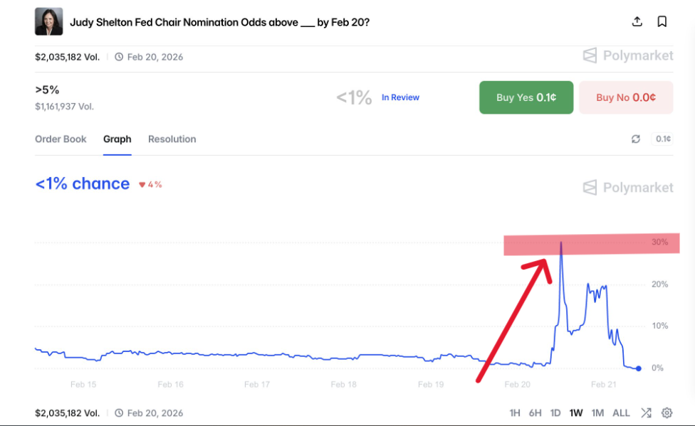 Conforme a su exposición, ese mercado habría sido inflado artificialmente del 0,6 % al 30 %, un salto de 5.000%. Sin embargo, al momento de la revisión por parte de CriptoNoticias, el mercado relativo a “Judy Shelton y la FED” no estaba disponible para operar en la web de Polymarket.