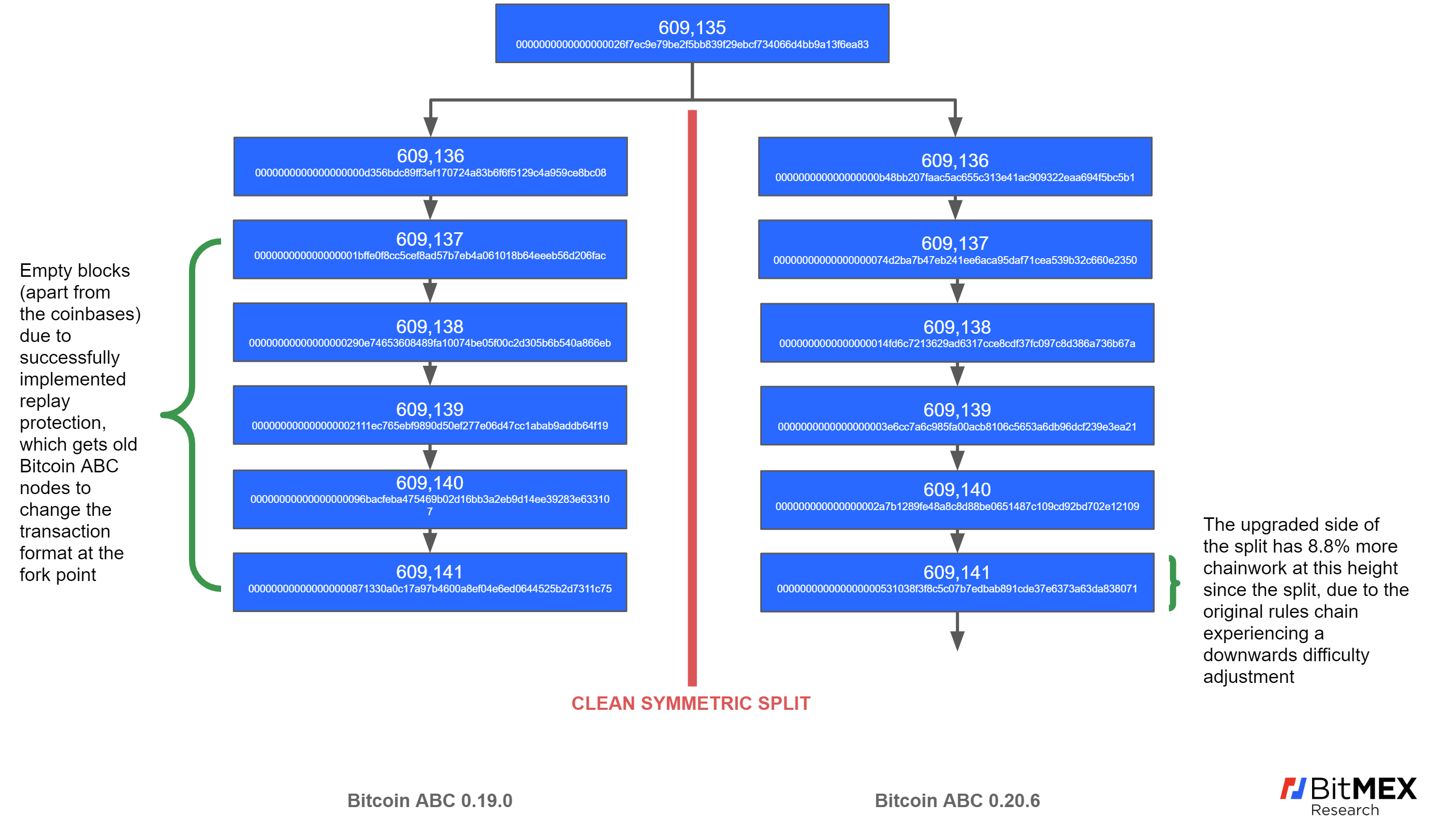 Al momento de la redacción de este reporte, cada cadena había producido paralelamente seis bloques, cinco de los cuales fueron minados como bloques vacíos del lado de la cadena antigua. Según explicó BitMEX Research, esto se debe a un sistema de protección contra ataques de repetición implementado exitosamente por Bitcoin Cash, que hace que los nodos cambien el formato de las transacciones en el punto de bifurcación.