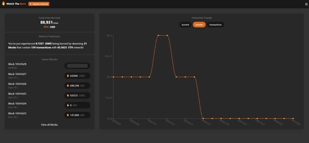 El portal permite ver las estadísticas de «la quema de comisiones», que se están realizando dentro de la red de pruebas de Ethereum desde el pasado 24 de junio, según lo reportó CriptoNoticias. El desarrollo de esta página estuvo integrado por un par de programadores del ecosistema Ethereum: Mohamed Mansour y Marius van der Wijden.