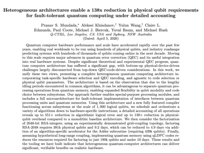 Además, el estudio introdujo una arquitectura heterogénea: en lugar de usar un solo tipo de cúbit para todas las tareas, combinó distintos tipos de cúbits y códigos de corrección de errores según la función específica de cada componente. Algunos cúbits actúan como procesadores, otros como memoria.