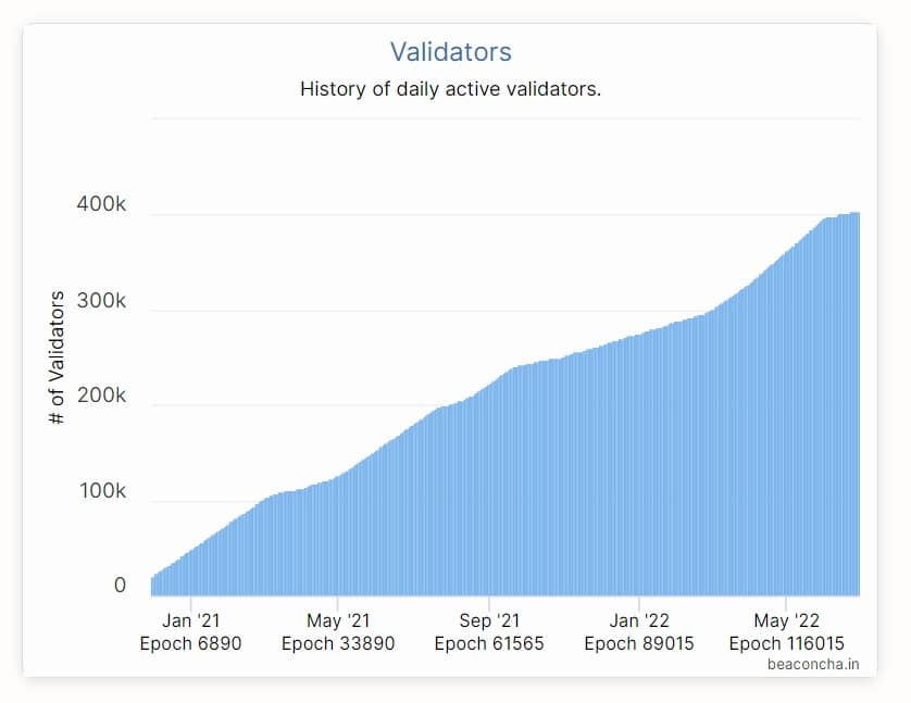 En este sentido, la red de Ethereum 2.0 goza de buena salud. Al momento de redacción de este artículo, existen más de 404.000 validadores que depositaron fondos para colaborar con el mantenimiento de la red, ya sea de forma directa o mediante un pool (piscina) de staking. Es más, los ETH acumulados por stakers tan solo en el pool de Lido ya superan a todo el valor de la red de Binance.