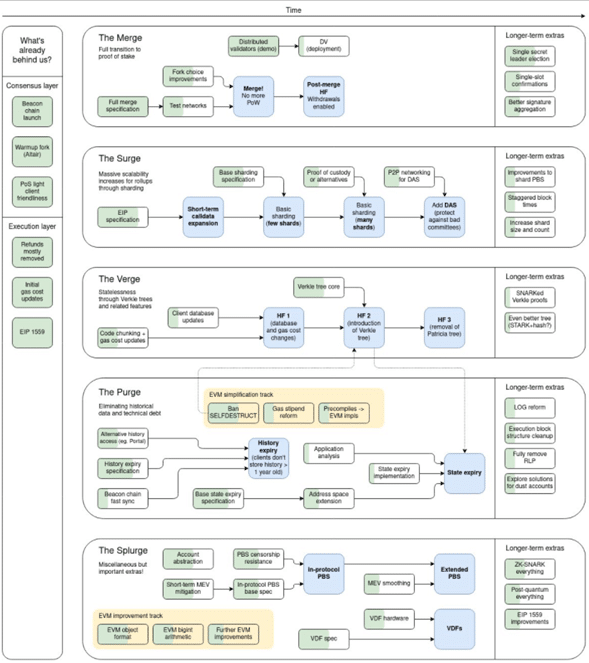 En el diagrama, Vitalik señala lo que «ya está listo» y actualmente se encuentra operativo dentro de Ethereum 1.0, como la Beacon Chain, activada en diciembre del año pasado, el fork de Altair, la quema de comisiones, la EIP-1559 para la reducción de tarifas, y el cliente ligero de PoS en Ethereum.