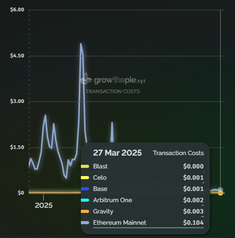 Al momento de este artículo, según Grow de Pie, la red principal de Ethereum registra un costo de transacción promedio de 0,1 USD aproximadamente, mientras que las L2 presentan tarifas mucho más bajas. Por ejemplo, las dos L2 más operadas de ese ecosistema, Arbitrum y Base tienen actualmente un costo promedio de transacción de 0,002 y 0,001 dólares.