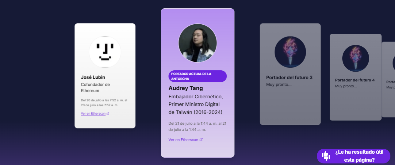 “Para conmemorar este hito histórico, presentamos el NFT de la Antorcha de Ethereum, un NFT que encarna el espíritu de descentralización y comunidad que ha definido la primera década de Ethereum. Al igual que una llama ceremonial que viaja de comunidad en comunidad, la Antorcha de Ethereum recorrerá el ecosistema global de Ethereum. Este NFT especial será pasado de monedero a monedero entre miembros cuidadosamente seleccionados de la comunidad, desarrolladores y constructores que han moldeado la historia de Ethereum durante los últimos 10 años.”