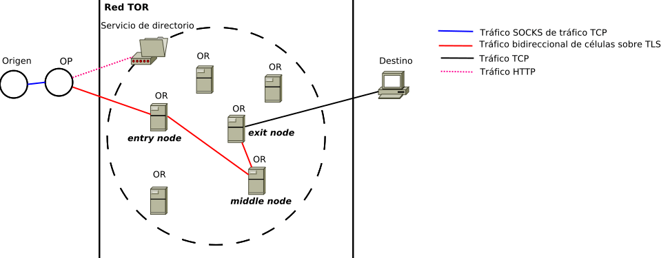 Tor es una red diseñada para ocultar la dirección IP de un usuario mediante la técnica «onion routing». Se trata de un sistema que cifra y envía los datos a través de múltiples nodos (o capas, como una cebolla, de ahí «onion«) para evitar que alguien pueda identificar el origen del tráfico.