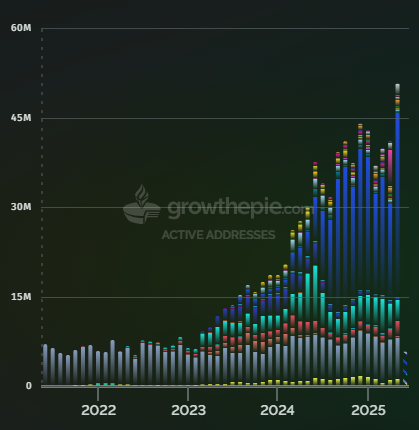 Adicionalmente, la red, incluyendo su capa base y soluciones de segunda capa (L2), procesó 706 millones de transacciones en mayo, superando el pico de enero de 701 millones.