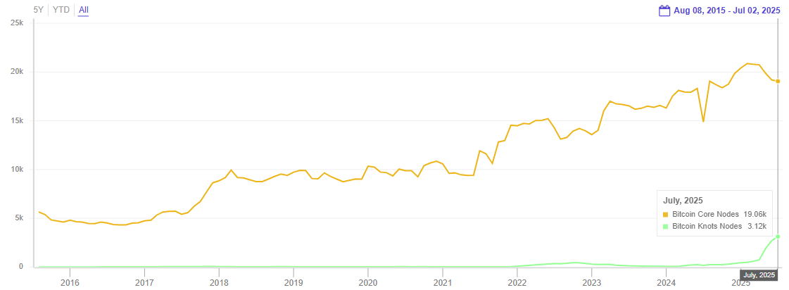 Core domina el 86% de nodos, pero la adopción de Knots crece rápidamente desde abril pasado.