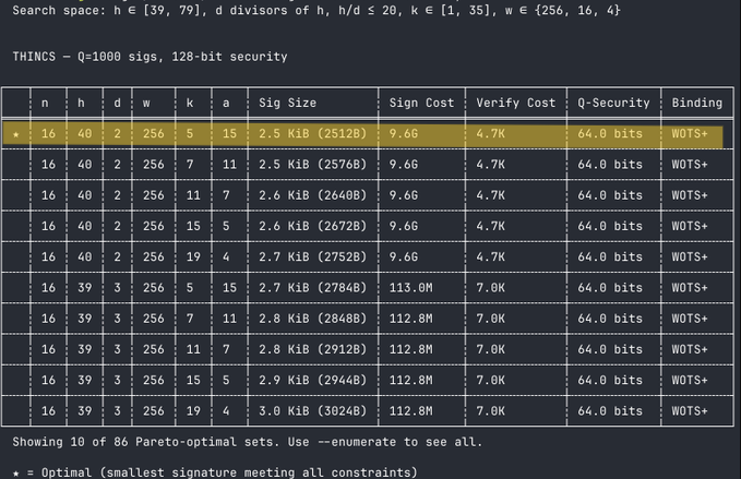 THINCS apunta a resolver eso permitiendo al usuario especificar cuántas firmas necesita y qué nivel de seguridad requiere, y encontrando el esquema más pequeño posible que cumpla esas condiciones. Conforme a una imagen compartida por Deegan, para 1.000 firmas con seguridad de 128 bits, el esquema óptimo produce firmas de 2.512 bytes, frente a los 7.856 bytes del estándar SLH-DSA compacto.