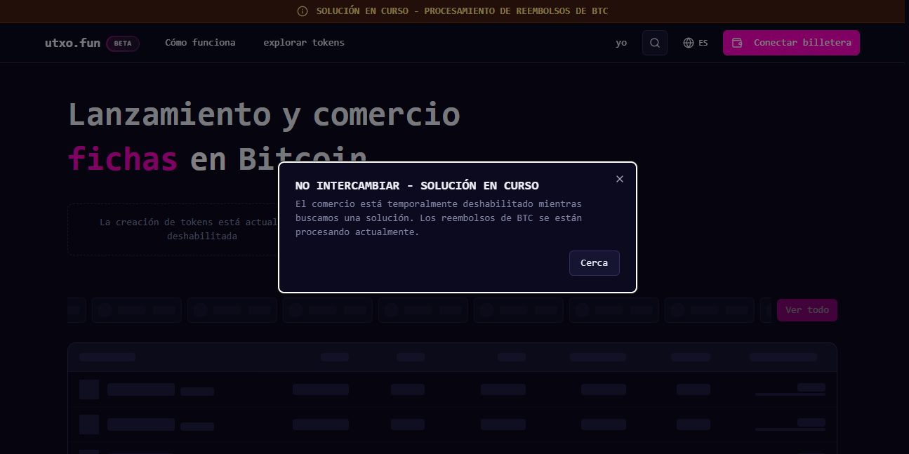 Al momento de este artículo, la web de utxo.fun sigue sin funcionar. Desde allí advierten que «el comercio está temporalmente deshabilitado mientras buscamos una solución. Los reembolsos de BTC se están procesando actualmente»: