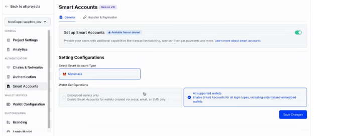 Adicionalmente, las Embedded Wallets pueden conectarse «a más de 40 redes compatibles (con y sin Máquina Virtual de Ethereum)» y usarse con la función de smart wallets, como lo muestra la siguiente imagen: