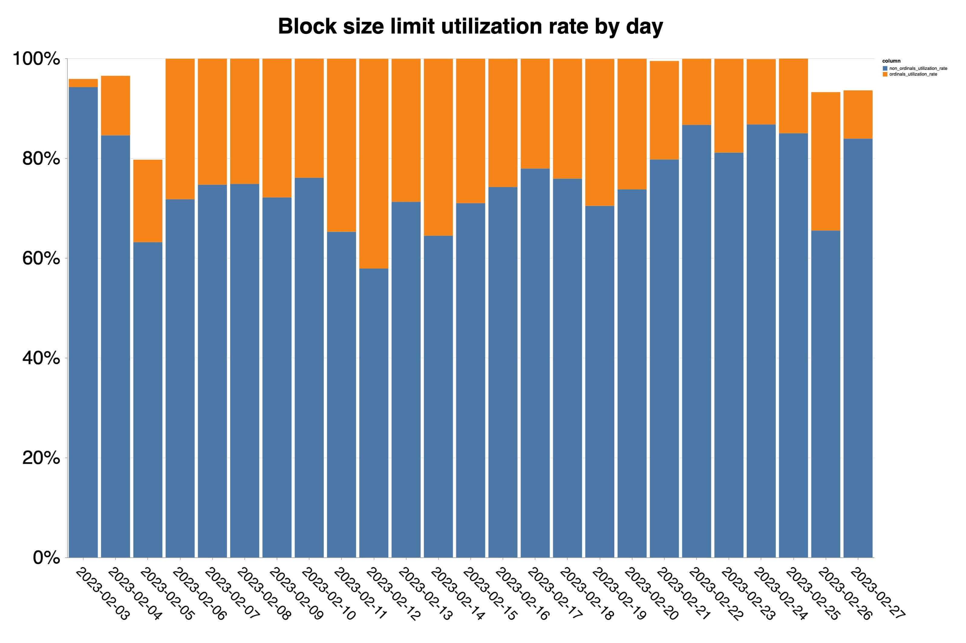 Ademรกs, en ese lapso de tiempo se puede apreciar que los NFT Ordinals (en naranja en el grรกfico) ocupaban una porciรณn importante del espacio de cada bloque. El pico en este sentido fue el 11 de febrero, cuando casi la mitad del espacio fue llenado por estos tokens, que tienen la capacidad de almacenar archivos directamente en la blockchain de Bitcoin, y por eso producen bloques tan pesados.