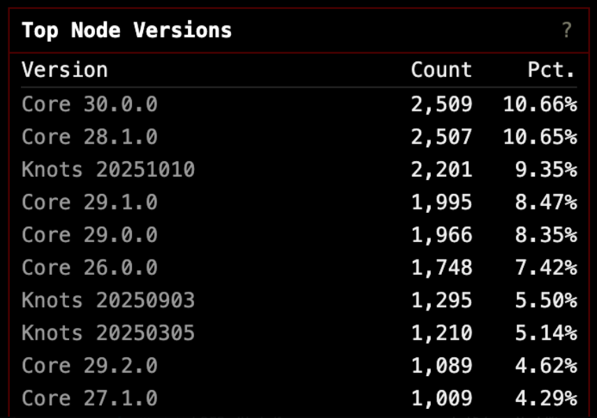 La última actualización de Bitcoin Core, v30, publicada el 12 de octubre, se consolidó como una de las dos versiones de clientes más utilizados por los nodos de Bitcoin.