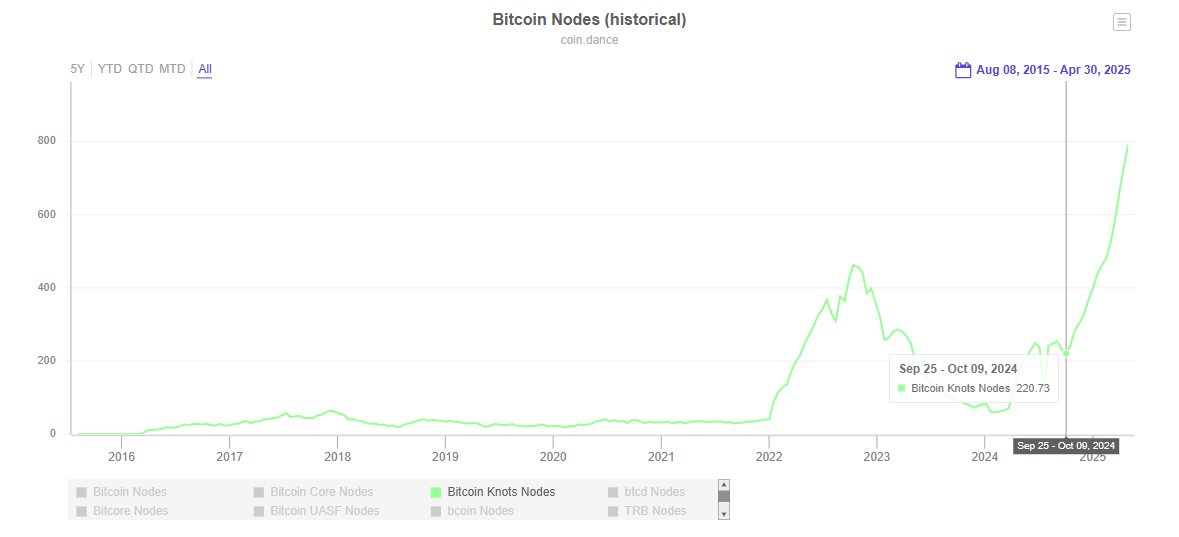 Conforme al sitio CoinDance, el número de nodos que operan Bitcoin Knots ha crecido de manera sostenida desde septiembre/octubre de 2024, pasando de 220 a 840 en abril de 2025. Es decir que, en los últimos 8 meses, ese incremento equivale a más del 280%.