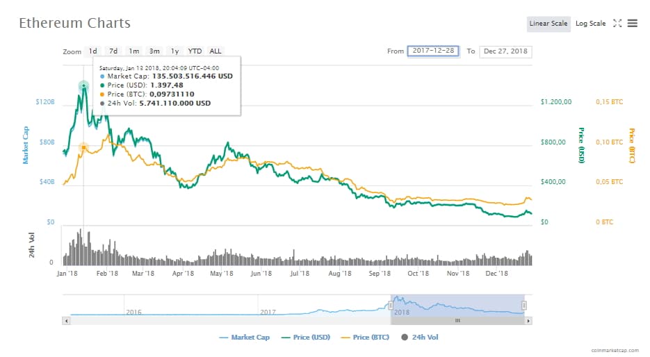 La criptomoneda de Ethereum perdiรณ gran parte de su valorizaciรณn en 2018