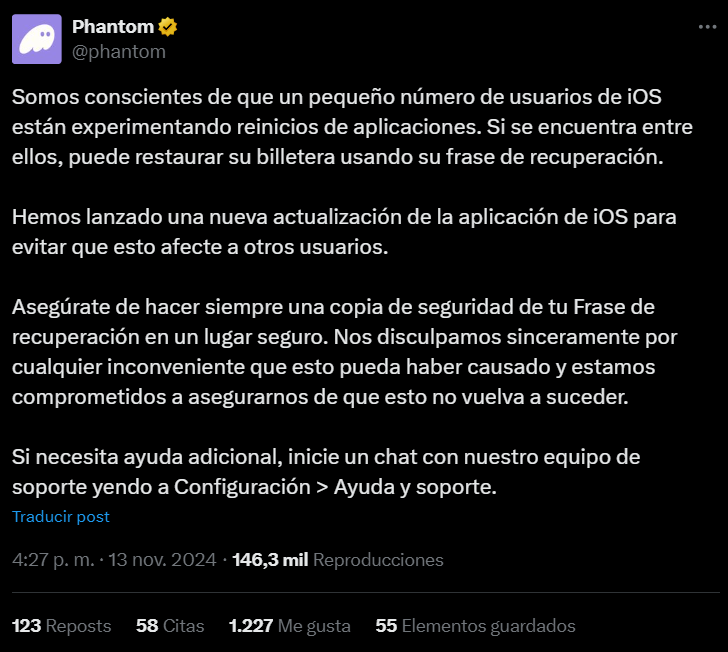 Usuarios en la red social X reportaron que una actualización de Phantom wallet en el sistema operativo iOS, de Apple, causó un cierre de sesión en algunas cuentas del monedero. Reiniciado el acceso a la wallet, Phantom solicitó a los usuarios importar o introducir sus frases de recuperación para ingresar de nuevo. Los usuarios que no resguardaron su frase semilla o la extraviaron, perdieron el acceso a sus fondos.