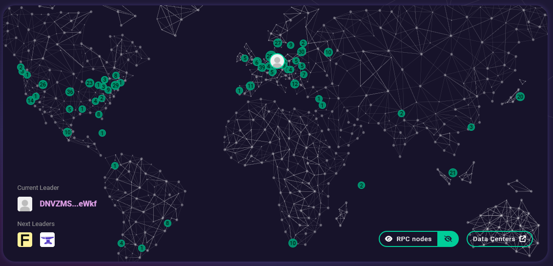 Como se puede ver en la siguiente imagen extraída del sitio validator.app, la mayoría de los nodos validadores de Solana están ubicados en Europa y en EE. UU.: