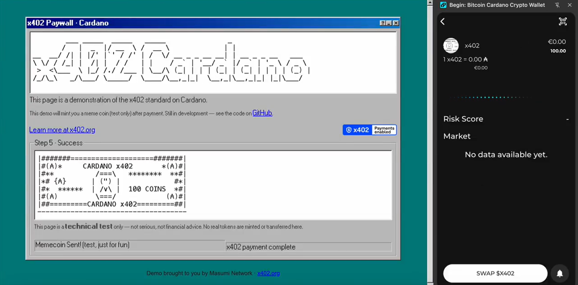 Esa prueba de concepto significa que se ha alcanzado una demostración técnica de la integración de x402 en Cardano, mediante la creación de una memecoin como prueba de que el protocolo puede ser utilizado para realizar pagos y acuñar activos digitales de manera descentralizada y automatizada.