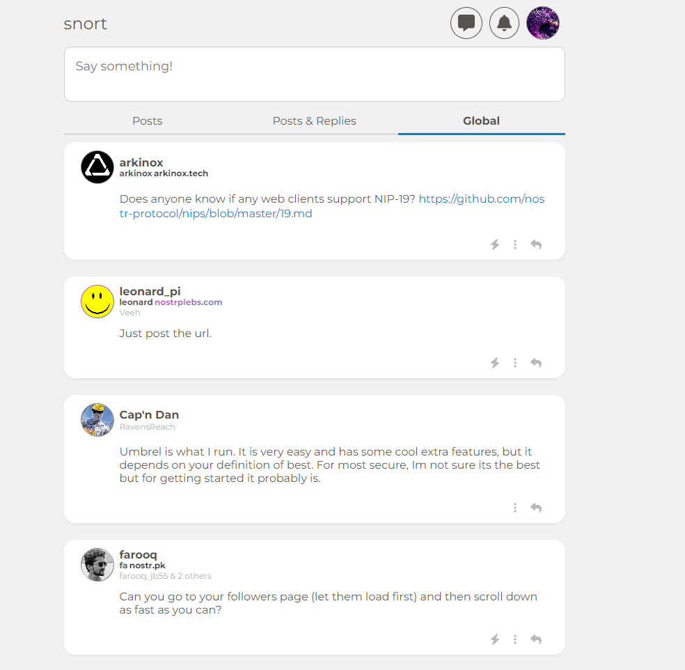 Un ejemplo de ello es Snort, un cliente de Nostr, que emula la interfaz y experiencia de usuario de Twitter. Su funcionamiento es muy básico: el usuario crea una cuenta generando sus llaves públicas y privadas (o bien se conecta utilizando unas ya generadas), y comienza a interactuar con demás usuarios dentro de su red. Este es básicamente la forma de funcionar de todos los clientes en Nostr.