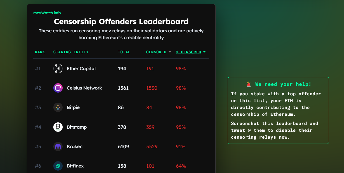 Concretamente, esto sería escoger un pool de staking que no utilice MEV-boost. Puede ser algo complejo hoy en día, dado que solo el 8% de los bloques de Ethereum no lo usaron en las últimas 24 horas. Sin embargo, también hay un 56% de bloques que sí usaron MEV-boost pero sin ser cumplidores de las normas OFAC, y es posible sumarse a los pools que controlan esos validadores.
