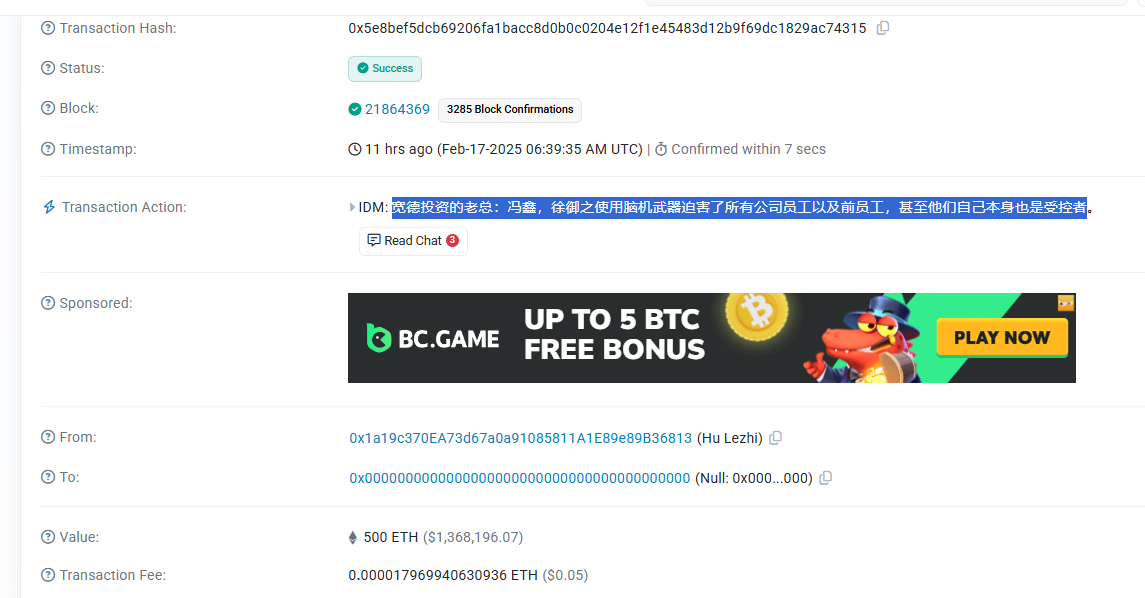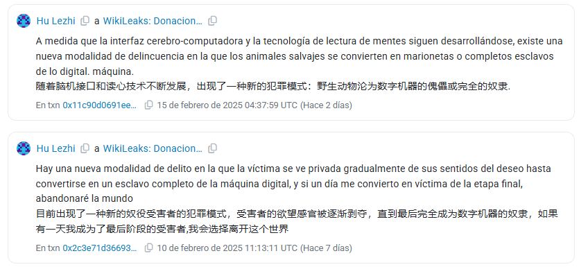 El autor de las transacciones, que se identifica como Hu Lezhi, un programador y emprendedor, asegura en sus mensajes que ha sido víctima de una «organización de control mental» desde su nacimiento. Según él, en octubre de 2022 descubrió que estaba siendo monitoreado y manipulado desde su nacimiento, y que esta organización intensificó el daño hacia él tras el descubrimiento.