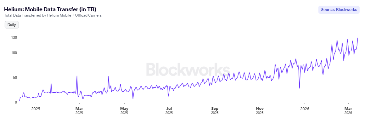 Adicionalmente, el aumento de usuarios se refleja también en el tráfico de datos en Helium. Según Blockworks, la red transfiere actualmente en torno a los 130 terabytes (TB) diarios, frente a los 7 TB registrados el 6 de marzo de 2025, un aumento de casi 1.800 % en un año.
