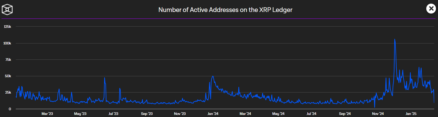De acuerdo con el portal de mรฉtricas de The Block, el cual integra las mรฉtricas de XRPscan, el 2 de febrero del 2025 habรญan 38 mill direcciones activas en la red. Al dรญa 12 del mismo mes, hay poco mรกs de 29 mil quinientas wallets activas.