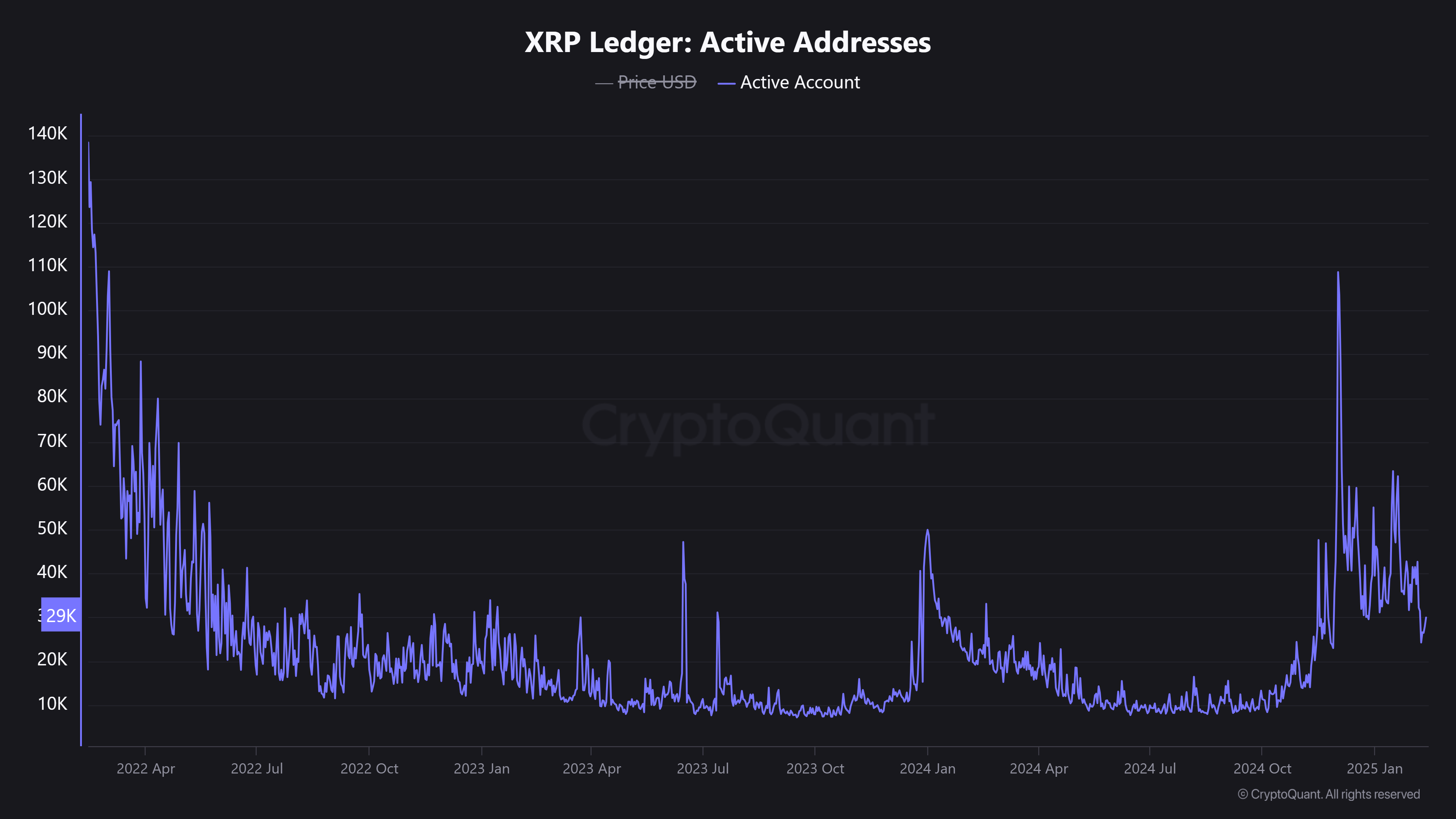 La caรญda de actividad en XRP ha sido significativa respecto a fin de aรฑo, cuando la red tuvo mรกs de 100 mil direcciones activas.
