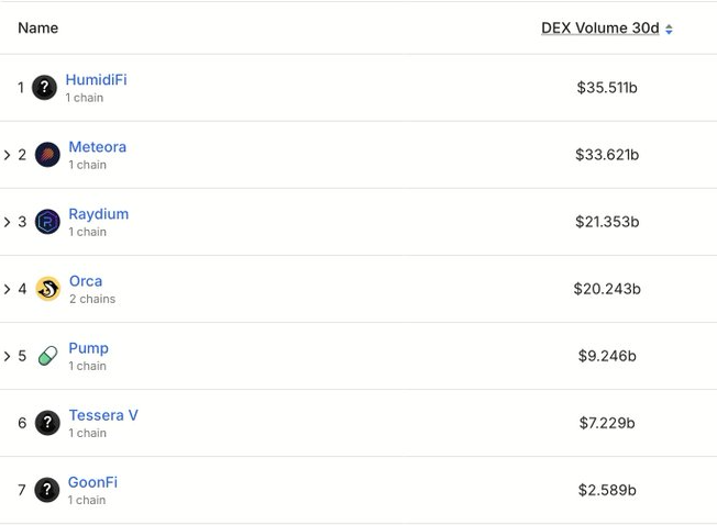 En ese período, HumidiFi registró un volumen de 35.500 millones de dólares, mientras que Meteora y Raydium alcanzaron 33.600 millones y 21.300 millones, respectivamente.
