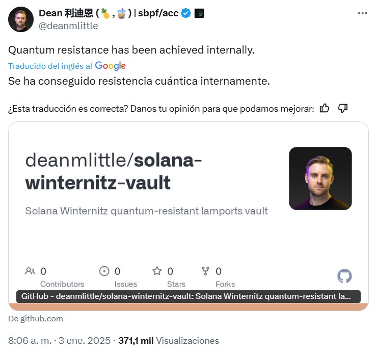 Para proteger los fondos de los usuarios, los desarrolladores de Solana han creado una solución resistente a los ataques de computación cuántica. Este recurso, denominado Solana Winternitz Vault, emplea un sistema de firmas basado en hash que genera nuevas claves para cada transacción. La información fue compartida por el programador Dean Little en un post de GitHub.