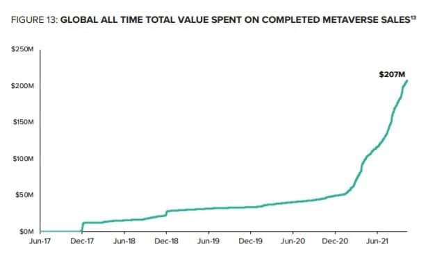El estudio calcula que el valor histórico invertido en ventas de artículos de los metaversos Web 3.0, tales como tierras virtuales, bienes y servicios, ha superado los USD 200 millones en lo que va de 2021.