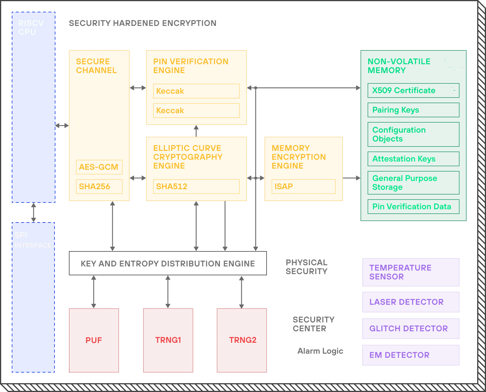 En cuanto a los aceleradores, TROPIC01 emplea uno dedicado a curvas elípticas, el método de cifrado asimétrico que utiliza el protocolo de Bitcoin para proteger las firmas digitales privadas. También emplea uno dedicado a SHA-256, el algoritmo que ejecuta la función hash de Bitcoin y convierte el conjunto de datos del protocolo en longitudes fijas. Este algoritmo contribuye a generar pares de llave privada y llave pública en Bitcoin.