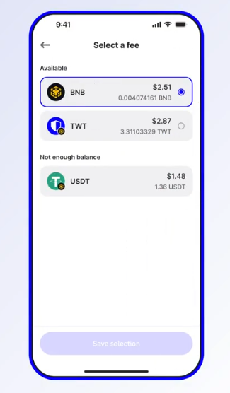 Por ejemplo, en la siguiente imagen extraída de una publicación de la cuenta de Trust Wallet en X, se puede observar cómo la wallet permite elegir con qué token pagar las tarifas:
