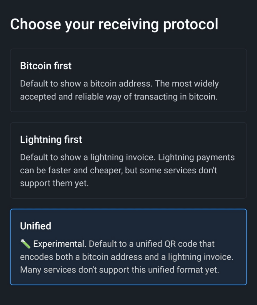 En este caso, con los QR unificados y la posibilidad de recibir de forma preferencial vía Litghning, el monedero se encarga de hacer el cambio entre una y otra red. Todo esto, sin que el usuario participe en el proceso. Se hace de forma automática.