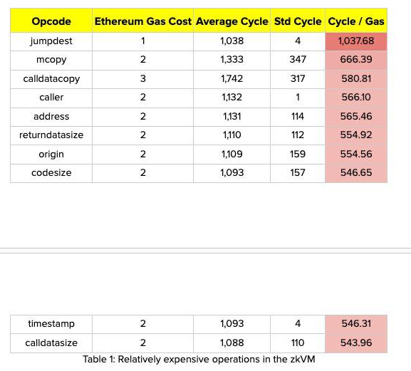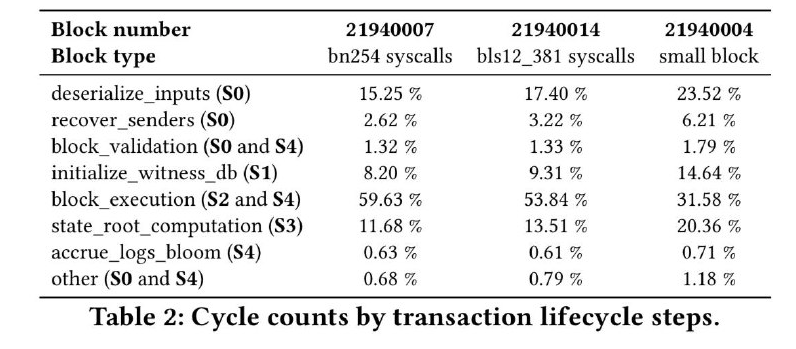 La siguiente tabla presentada por Buterin, que detalla los ciclos necesarios para probar diferentes partes de la ejecución en la EVM, muestra que cuatro circunstancias consumen la mayor parte del tiempo de procesamiento: