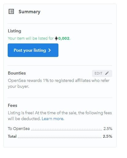 De lado derecho de tu pantalla, vas a ver un pequeño resumen de la puesta en venta. Algo curioso que encontrarás aquí son los Bounties o recompensas. Si alguien comparte el link y logra que tu NFT se venda, recibirá cierto porcentaje de entre 0,1% y 2,5%, que tú podrás definir. Este se descuenta del total de la venta. También puedes desactivar esta opción colocando una comisión de 0%.