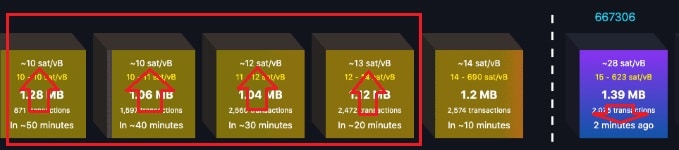 En este escenario, lo más recomendable es pagar una comisión por encima del monto mínimo que muestra el último bloque a punto de minarse. En el ejemplo de la imagen anterior sería 3 sat/vB, como lo indica la flecha roja de la izquierda. Sin embargo, debe tomarse en cuenta el monto mínimo pagado en el último bloque minado, y el tiempo de espera entre ambos bloques.