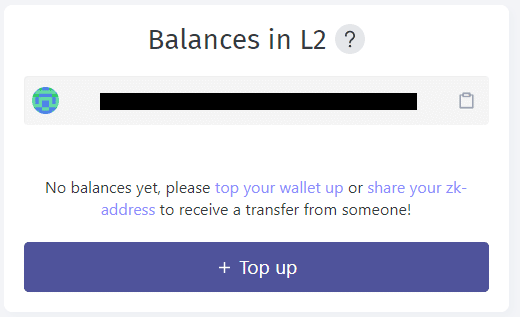 Se te informará, tal como se observa en la siguiente imagen, que no posees balances en la segunda capa (L2, por sus siglas en inglés) de Ethereum, zkSync. Para añadirlos, debes hacer clic en «+ Top up».
