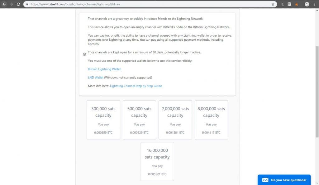 El servicio Thor presenta dos ventajas fundamentales. En primer lugar, podemos crear un canal de pago de manera muy rรกpida, siempre y cuando utilicemos mรฉtodos de pago inmediatos, tales como Coinbase, Localbitcoin o a travรฉs de la red Lightning. En segundo lugar, por un pequeรฑo pago podemos tener un canal de pago con una amplia capacidad. De la forma tradicional esto no serรญa posible, ya que deberรญamos bloquear parte de nuestros BTC para darle la capacidad al canal.
